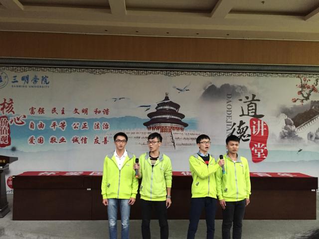 12月29日下午,以“怀爱国之心,做有志青年”为主题的三明学院道德讲堂第三十讲活动在图书馆报告厅举行,江芳俊副校长,宣传部、学工部、校团委、信息工程学院党政负责人及信息工程学院师生代表参加了本次讲堂。