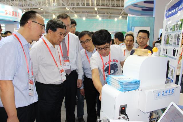 在高校科技成果展区,教育部科技发展中心主任李志民、省教育厅黄红武厅长、陈国龙副厅长等领导先后莅临我校展台指导,参观了机电工程学院任雯老师的项目成果“特种烫印机”,详细了解特种烫印机的功能和情况,并品尝了资源与化工学院黄河宁教授的自主研发的草珊瑚饮料。