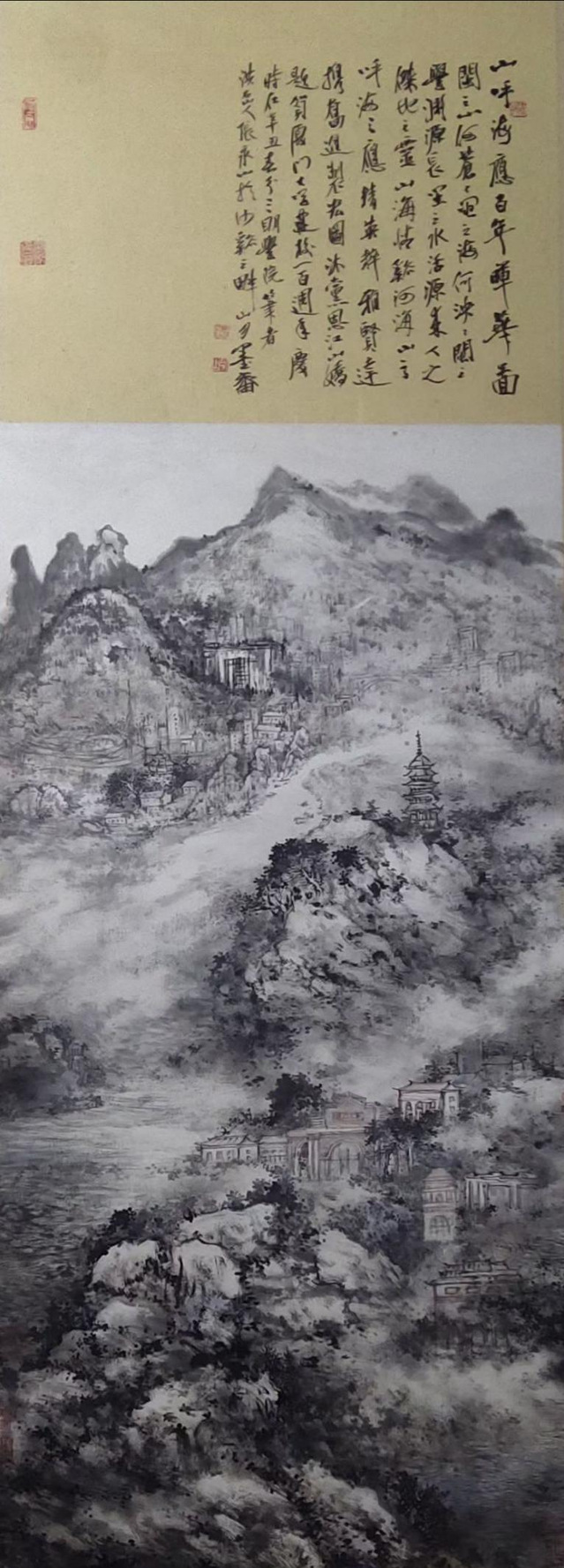《山呼海应百年晖华图》款跋曰:闽之山,何苍苍;闽之海,何泱泱;闽之学,渊源长;闽之水,活源来;人之杰,地之灵;山海情,溪河海;山之呼,海之应;精英粹,雅贤达;携奋进,制宏图;沐党恩,江山娇。画面以实际方位下而上、近而远分列为厦门大学校门、行政楼等。校园建筑在碧海烟波之间…中段为乌石山塔、书院…上高远处为虎头山下沙溪河畔万寿岩傍三明学院行政楼、周围是泰宁三剑峰永安大湖石林、桃源洞等表达了从乌石山上闽师源头到白城海滨厦门大学,三明学院与厦门大学百年渊源,情缘深厚;表达了山呼海应山海联动的承沿气脉,厚积薄发、气势磅礴,继往开来的高古吉祥意境。