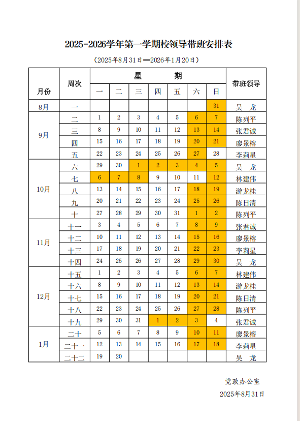 2025-2026学年第一学期校领导带班安排表